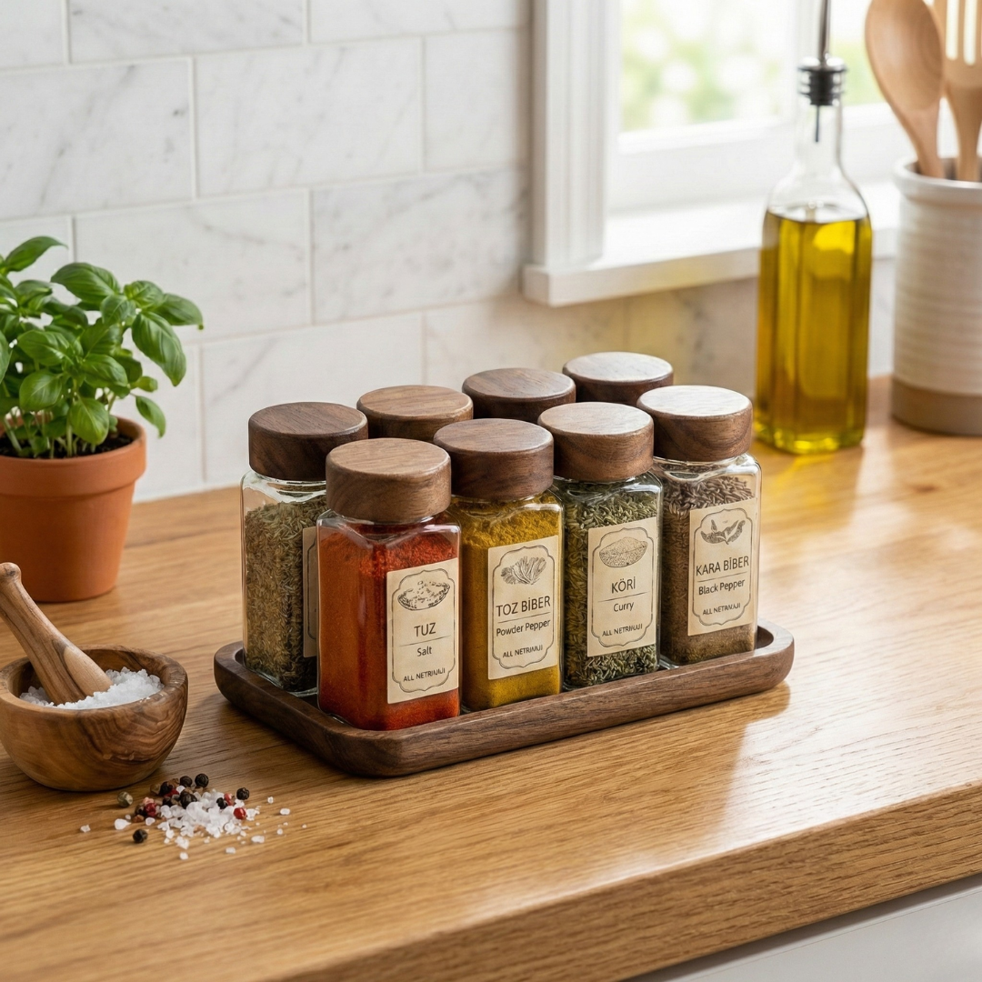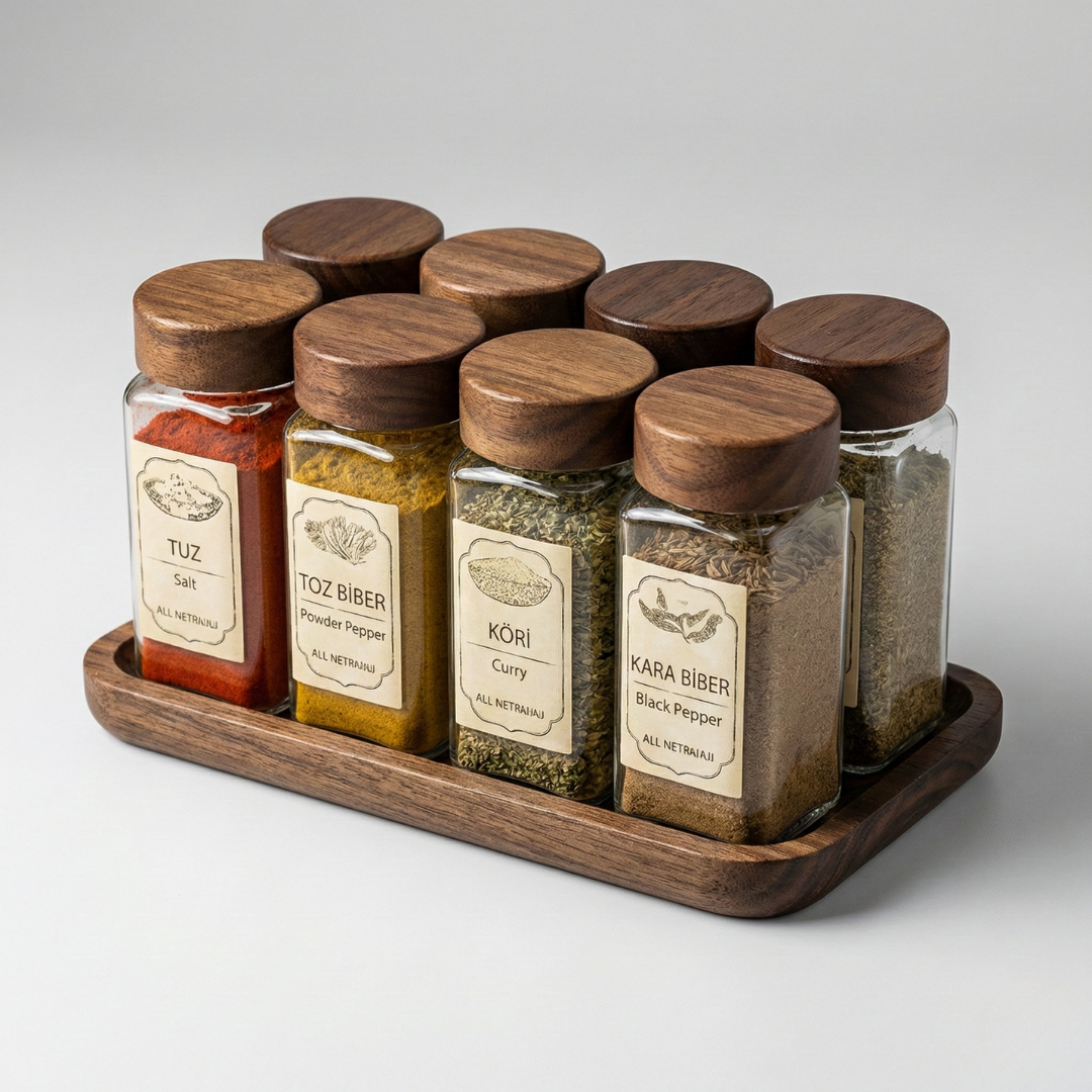 Karışık baharat çekmecelerine ve düzensiz tezgahlara veda edin. Gerçek Akasya ağacının sıcaklığı ile camın saflığını buluşturan bu 8'li set, mutfağınıza hem düzen hem de "Modern Farmhouse" şıklığı getiriyor. Özel ahşap tepsisi sayesinde tezgahınızda daima derli toplu durur, vintage etiketleriyle sofranıza nostaljik bir hava katar.