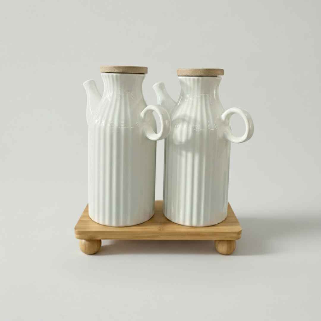 Plastik şişelerden ve damlatan metal yağdanlıklardan sıkıldınız mı? Mutfağınıza hem sağlık hem de estetik katacak Cookinaplus Bambu Standlı Porselen Set ile tanışın.