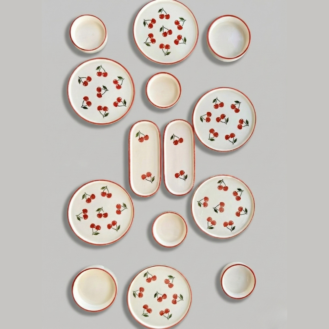 Sabahların en hoş anına davet: Kiraz Desenli 14 Parça Kahvaltı Takımı ile sofralarınız hem şık hem sıcak. Porselenin zarafeti, nostaljik kiraz deseninin neşesiyle birleşiyor — günlük kullanım için dayanıklı, misafir ağırlamak için gösterişli.
