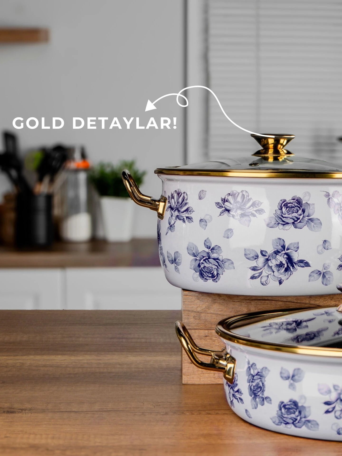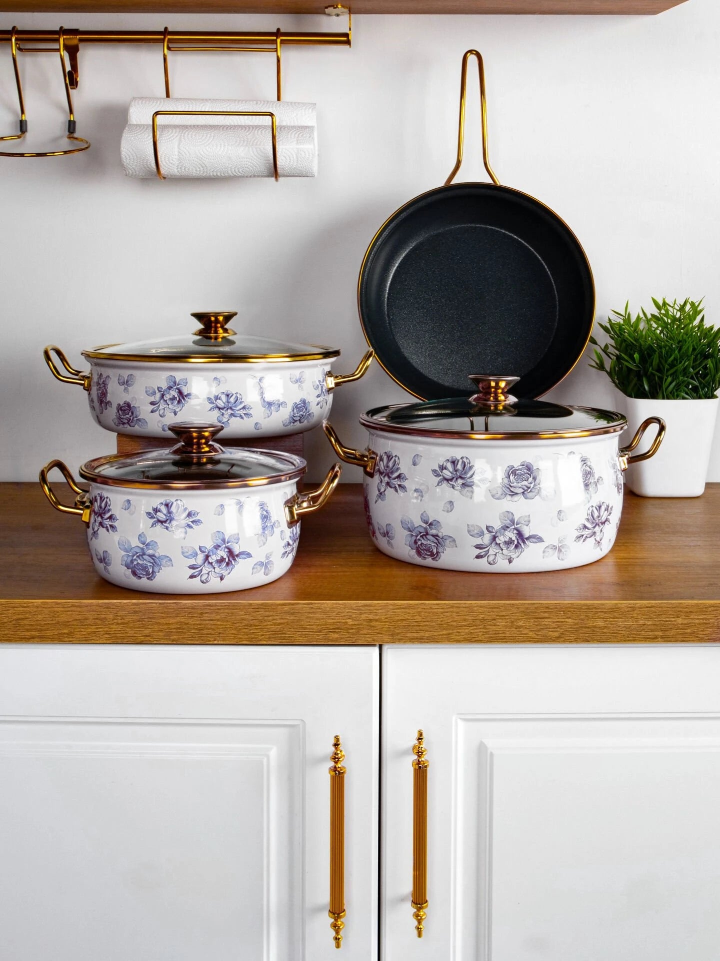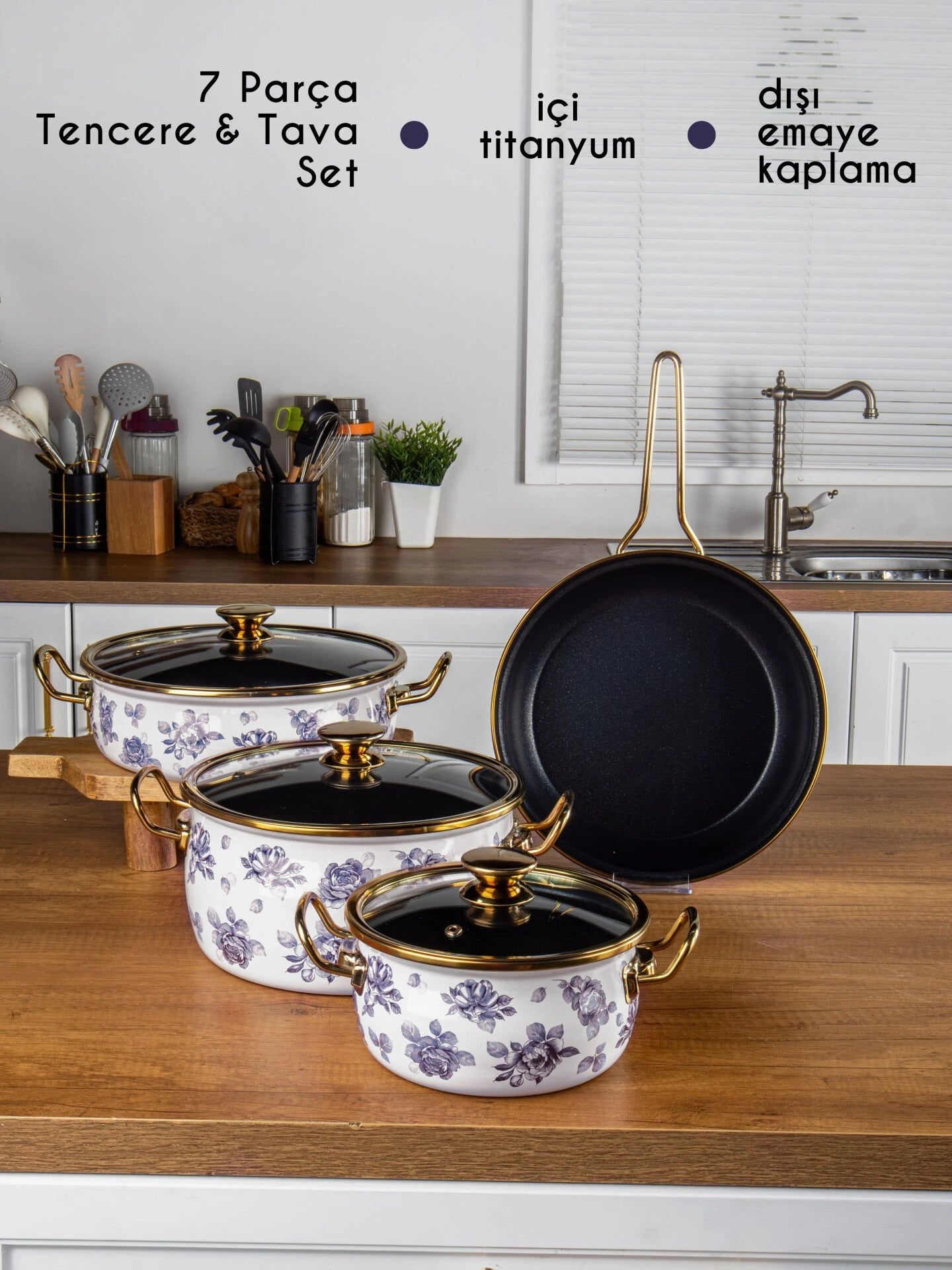 Lilium Emaye 7 Parça Mavi Gül Desenli Tencere Tava Set