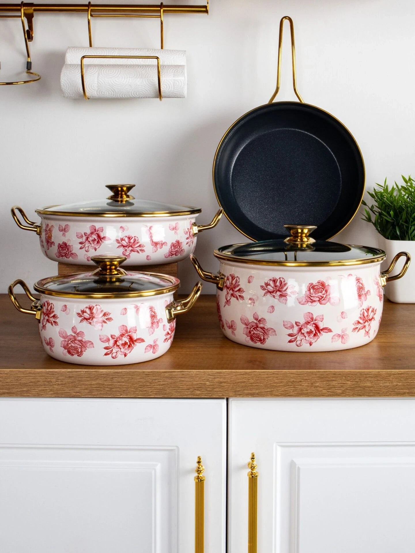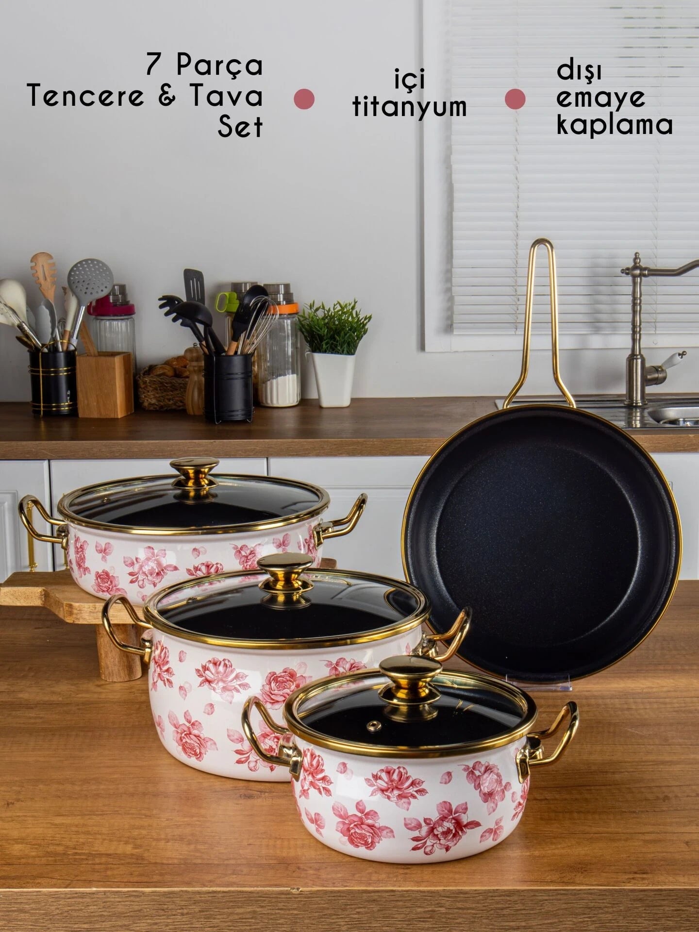 Lilium Emaye 7 Parça Pembe Gül Desenli Tencere Tava Set